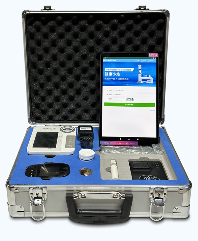 標配藍牙額溫槍、尿液分析儀、藍牙血壓計、心電采集盒,同時還可選配身高體重秤、視力檢測儀、肺功能儀、B超機等檢測設備。